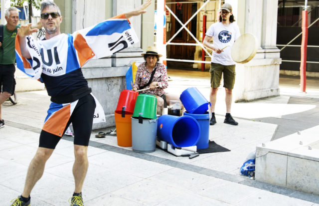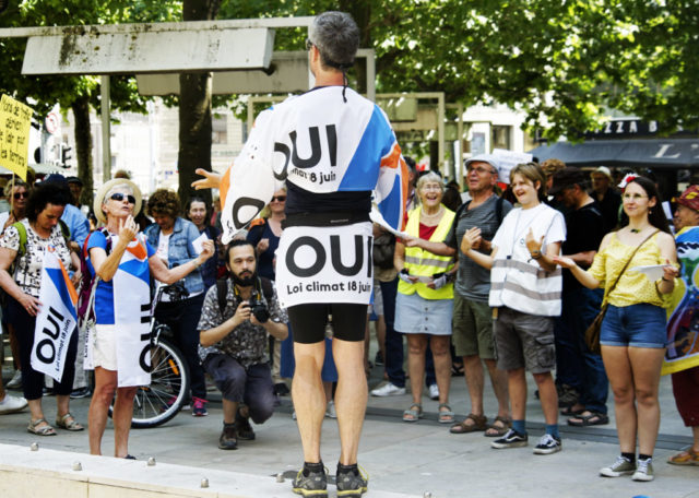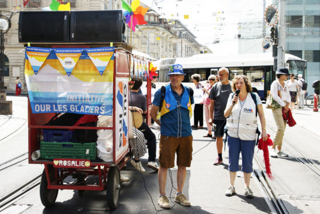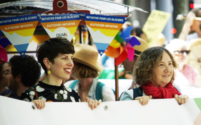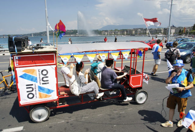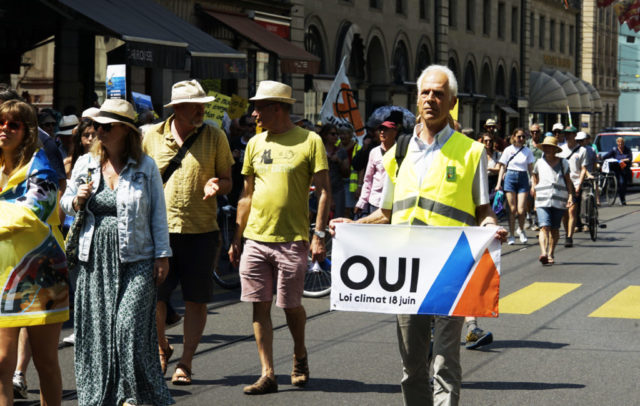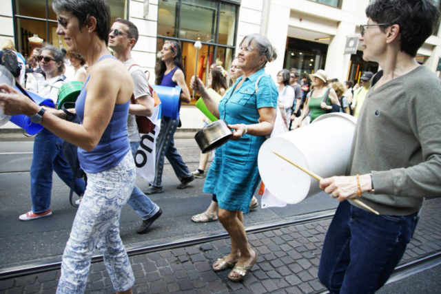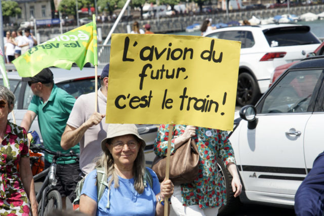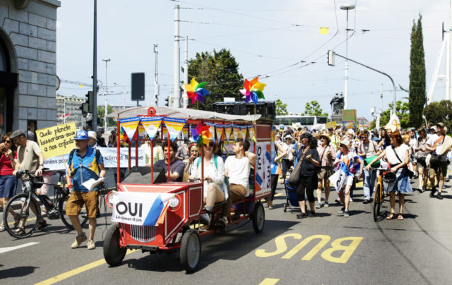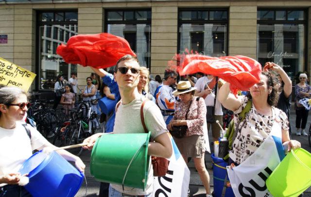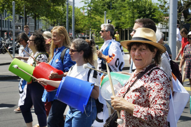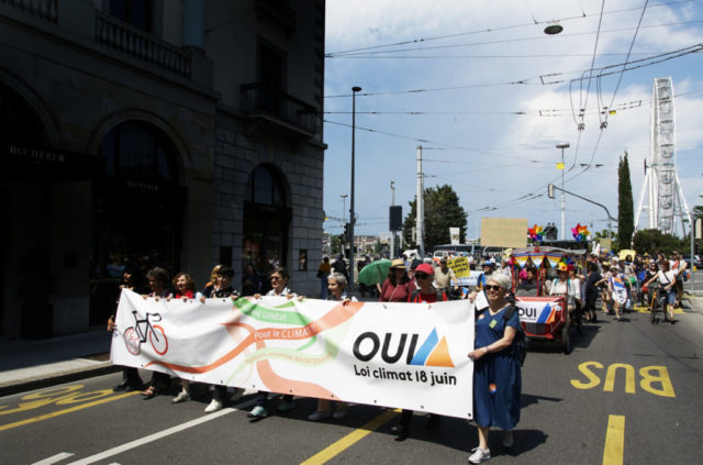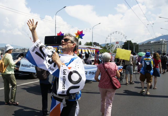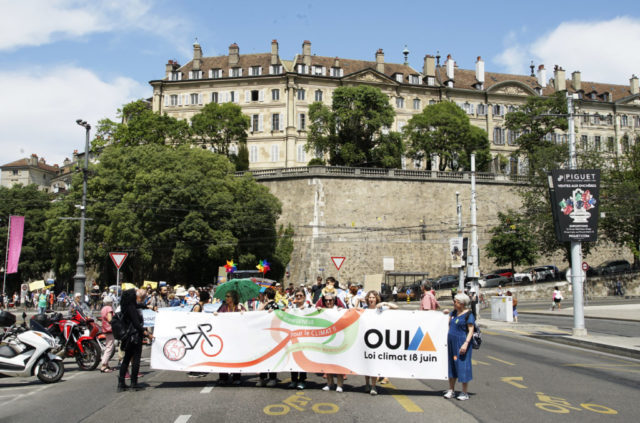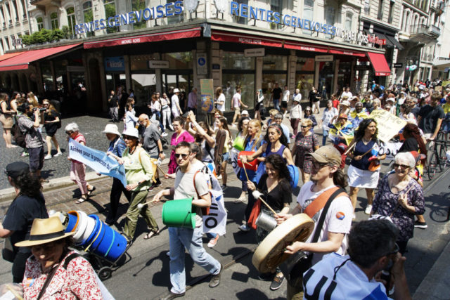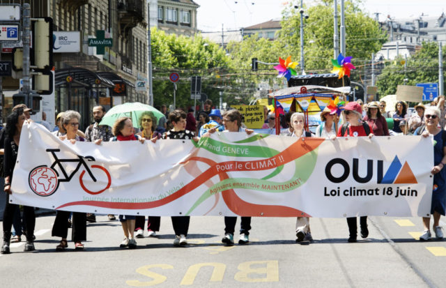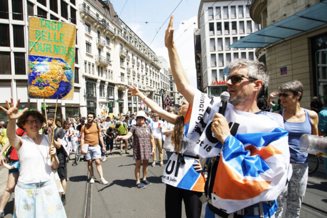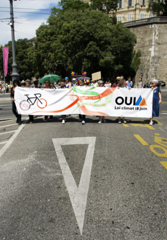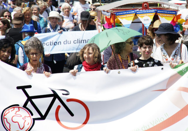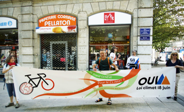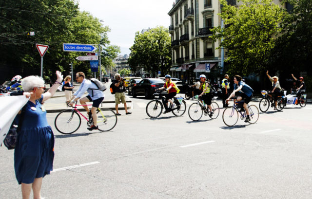 A l’occasion de la journée internationale du vélo, environ 200 marcheuses et marcheurs en ville de Genève et 100 cyclistes venant de France voisine se sont mobilisés pour le climat et la planète.